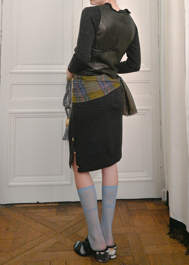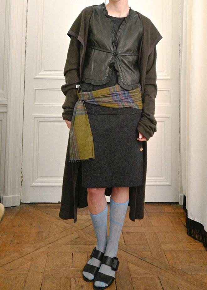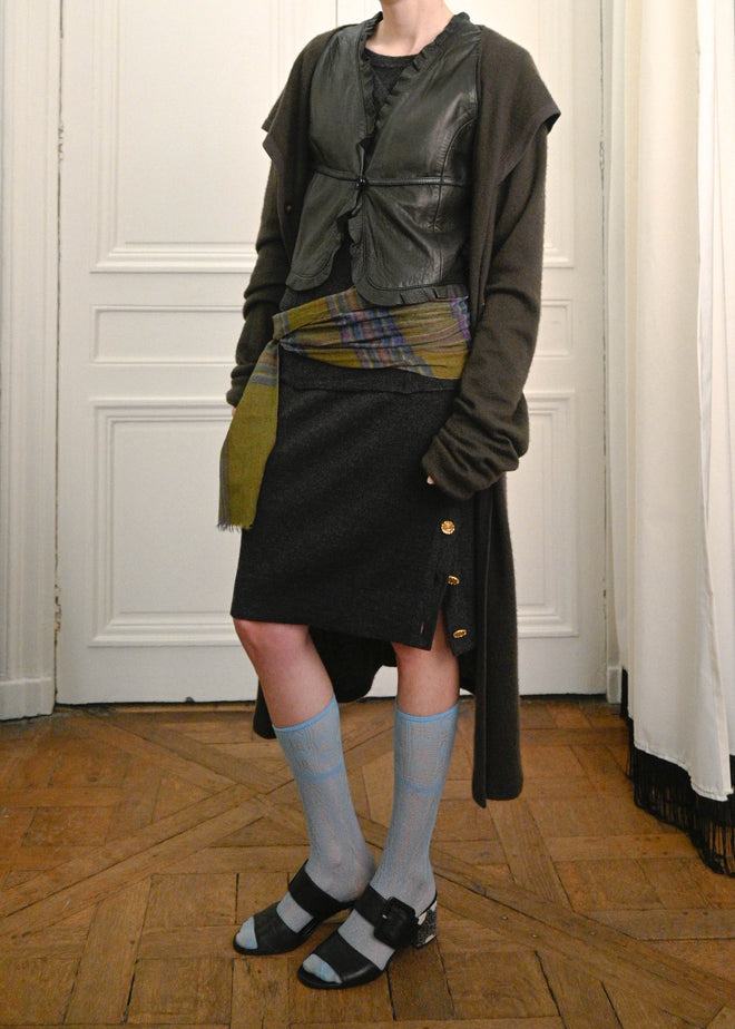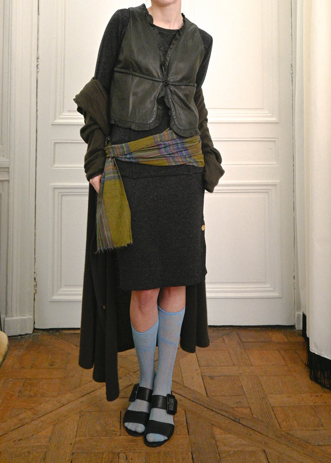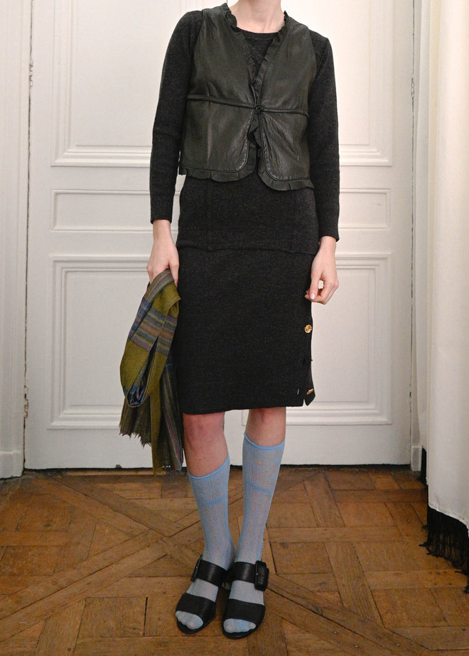 100% LAMB LEATHER VESTON JACKET WITH WAVE DETAIL AND SEALED WITH SINGULAR BUTTON, SILK INTERIOR LINING, A SOFT LEATHER ELEMENT