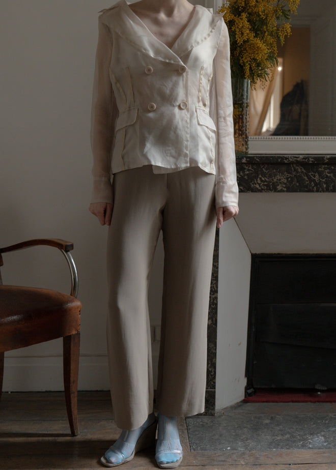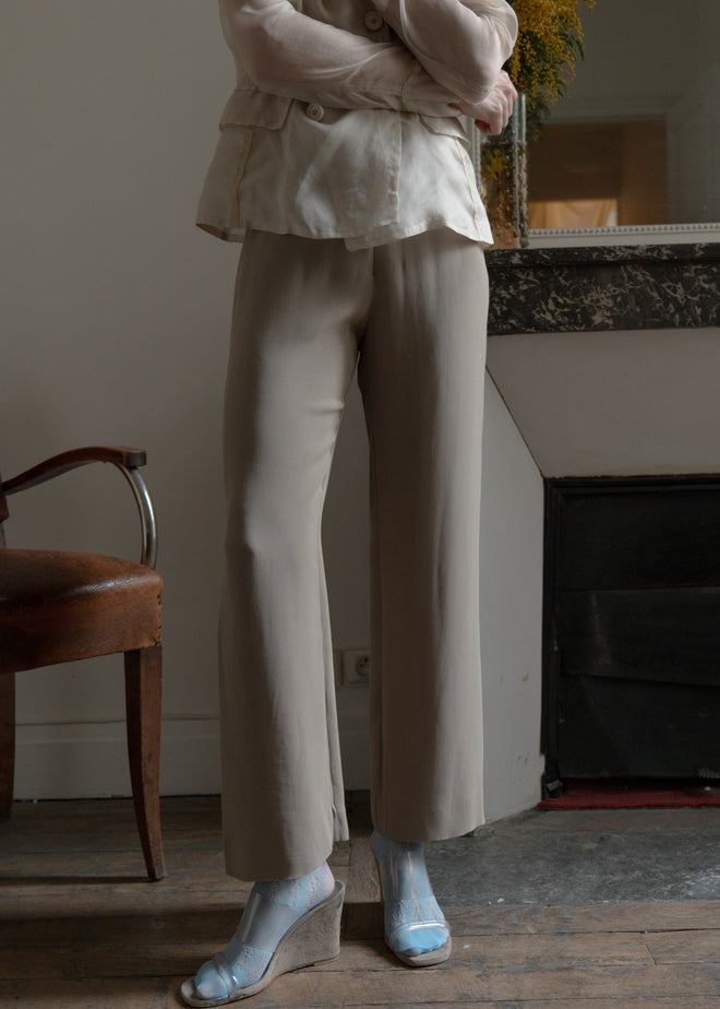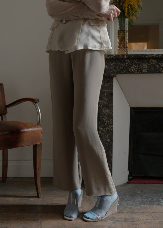 ARMANI 100% SILK PANTS, A GREY ALMOST SAGE COLOR, IN A BOOTCUT DESIGN WITH A HIGHWAIST, FLOWY AND BREATHABLE