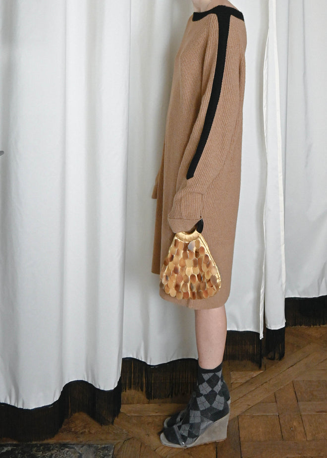 BALENCIAGA CAMEL MAXI SWEATER DRESS WITH A BLACK STRIPE DETAIL