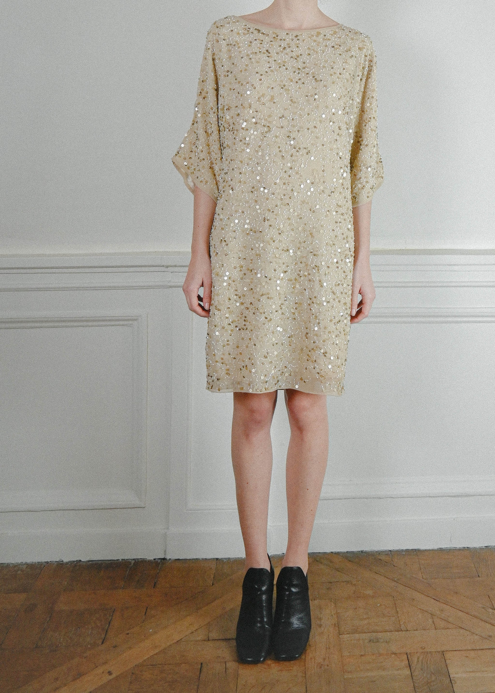 BEIGE SILK BASE WITH BEADED ABSTRACT PATTERNS AND OPEN SLEEVES