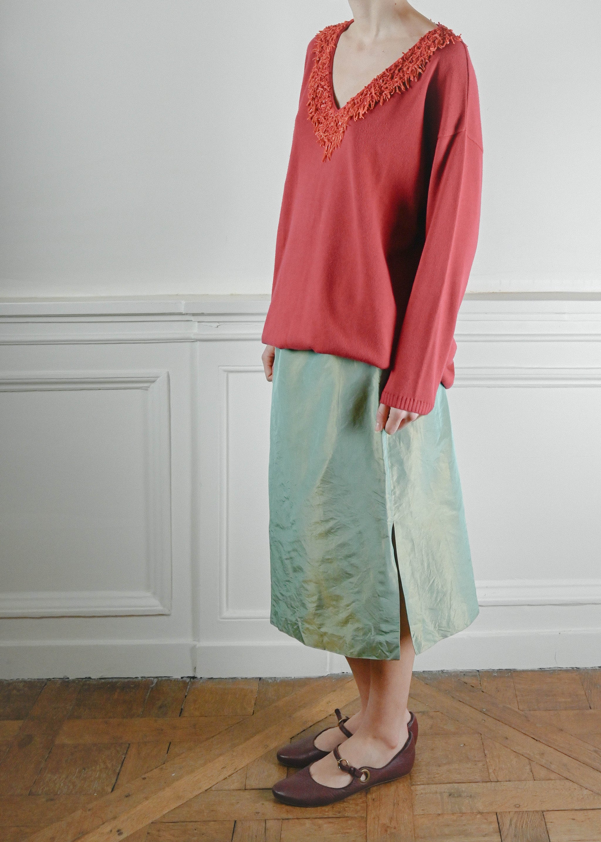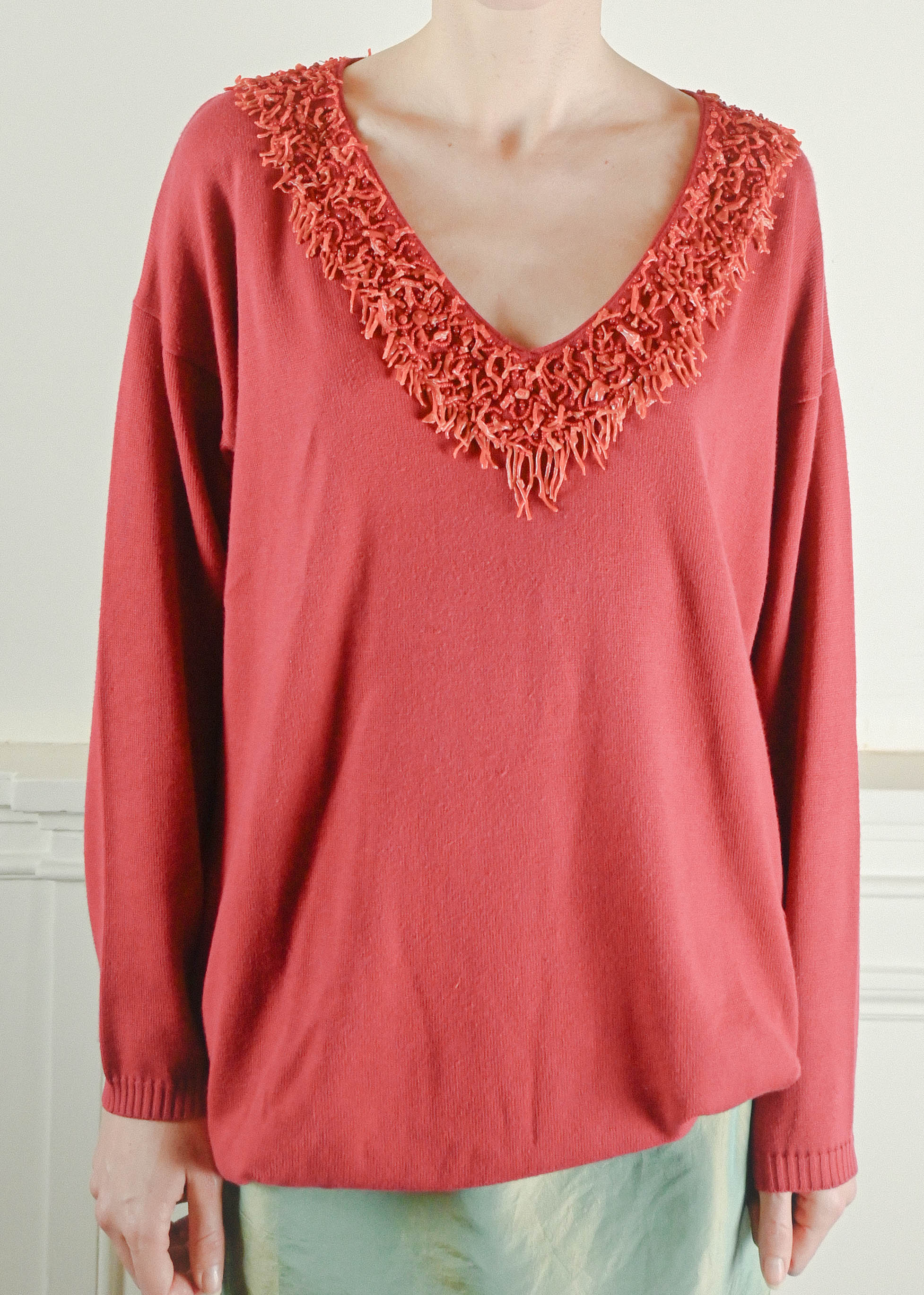 Blumarine oversize jumper made in a 100% cotton fabric, with coral beading on the V-neckline