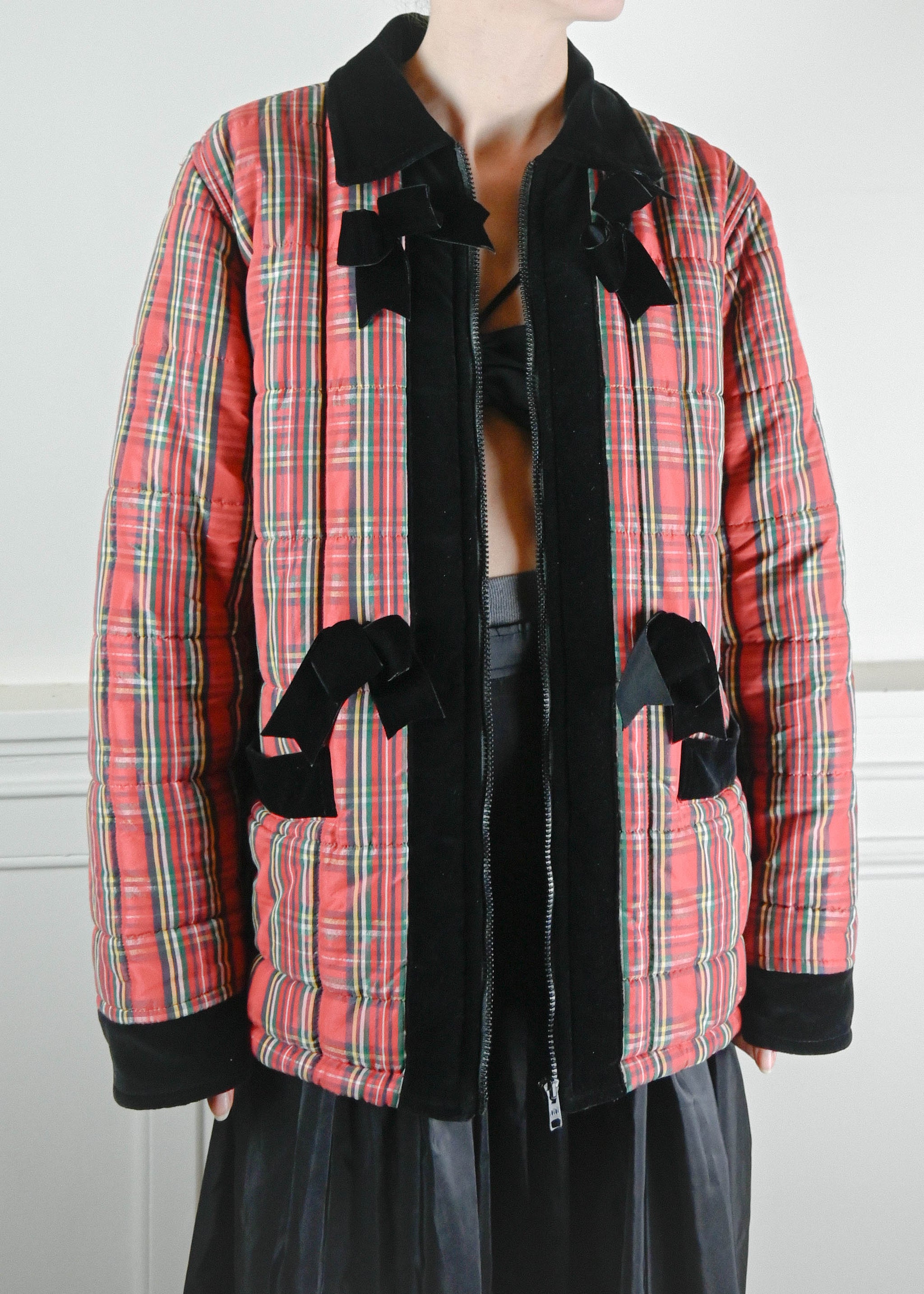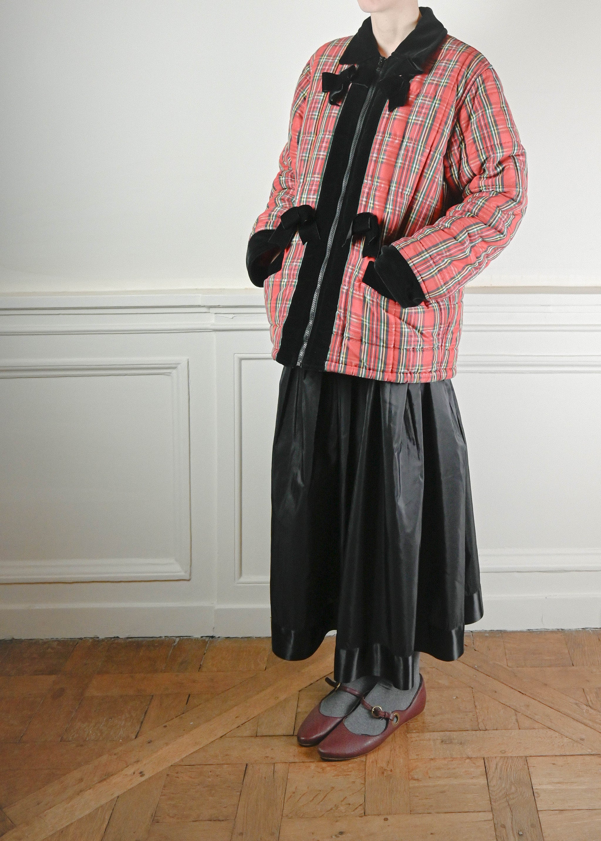 Made in Italy red tartan coat made in a cotton soft fabric, with black velvet bow detailing