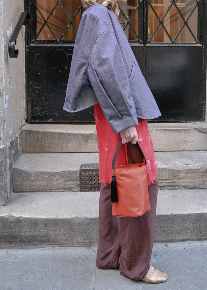 TURN PARIS bomber jacket in glazed Japanese denim, cut in a boxy silhouette with rounded sleeves and slanted pockets.