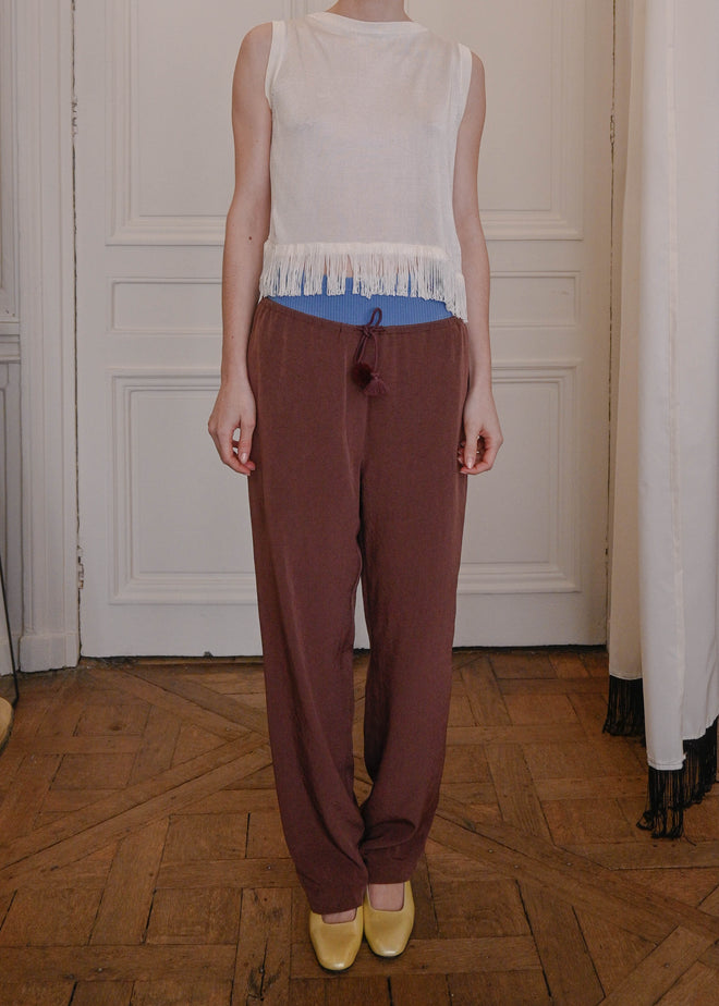 Tied at the waist with a custom-made asymmetrical pompon, crafted in France.