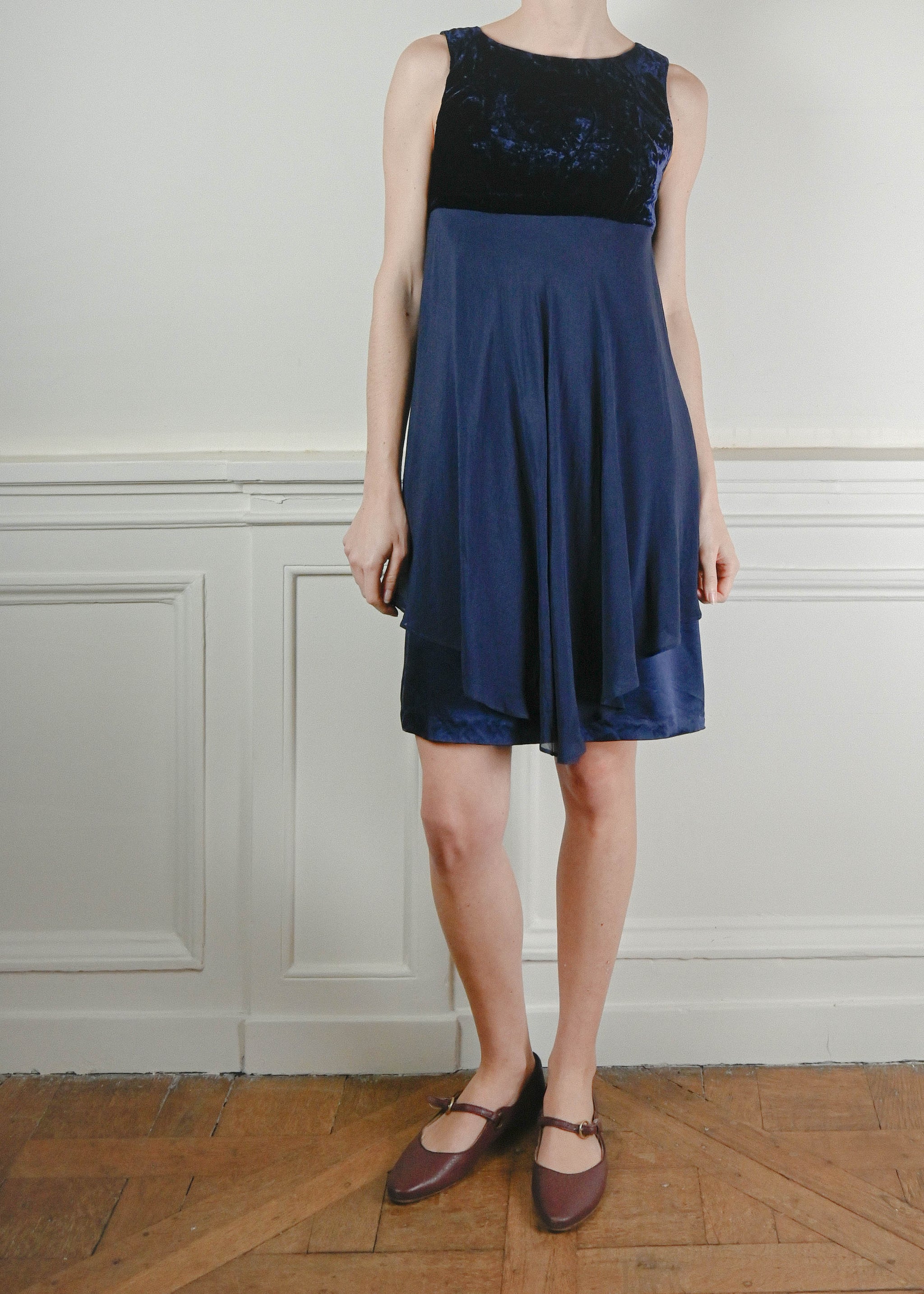 Made in Italy night blue dress with 100% silk overskirt, bodice in a mix of silk, cotton and viscose fabric, shiny velvet bust