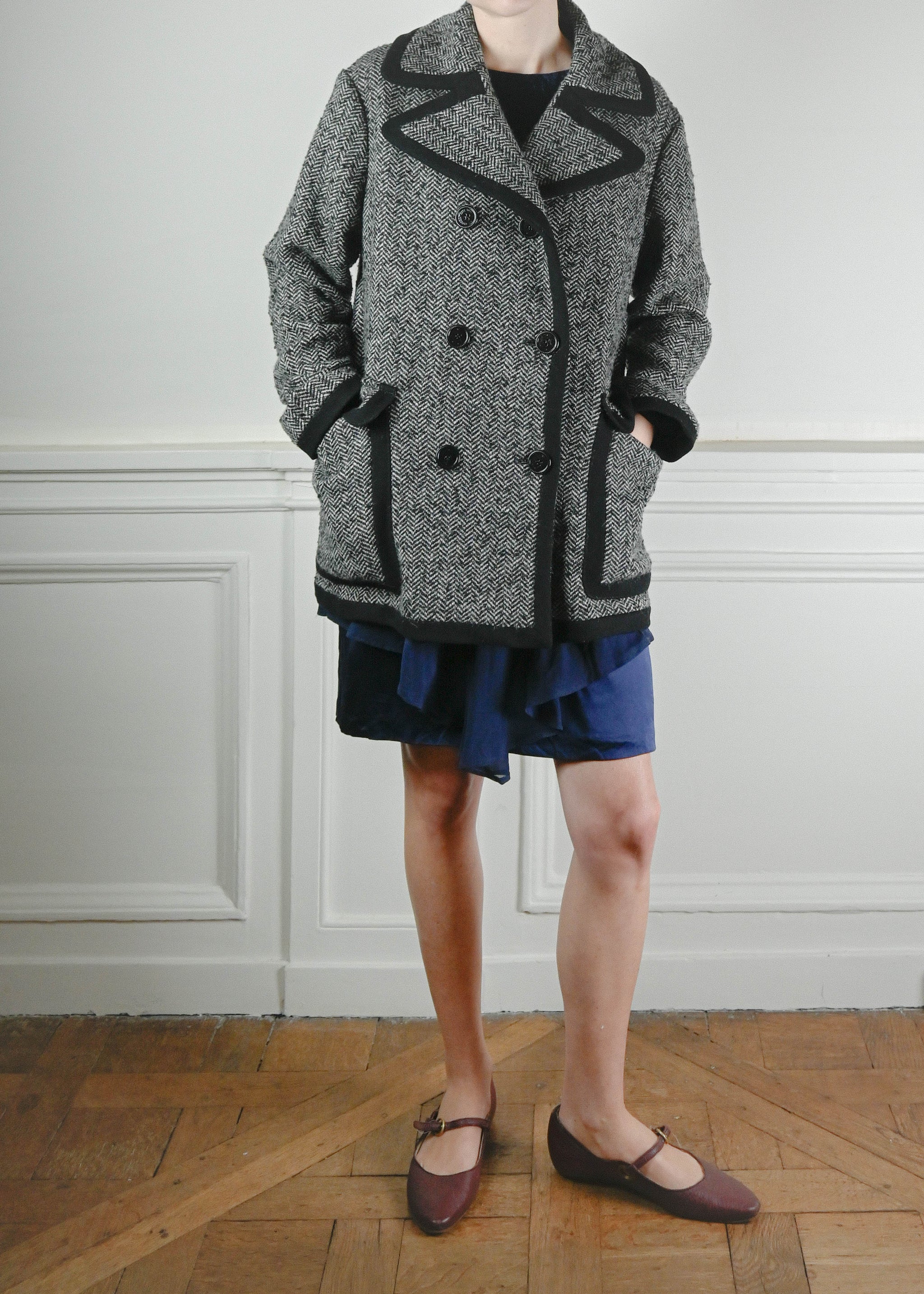 Moschino black and grey tweed coat made in a mix of wool and mohair fabric, with large balck buttons and lining