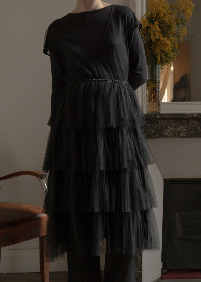 MADE IN ITALY LONG BLACK DRESS IN A TULLE FABRIC WITH MULTIPLE LAYERS AT THE SKIRT AND V NECK DECOLLETE, TRANSPARENT TOP WITH STRAIGHT LINE DOWN THE BACK
