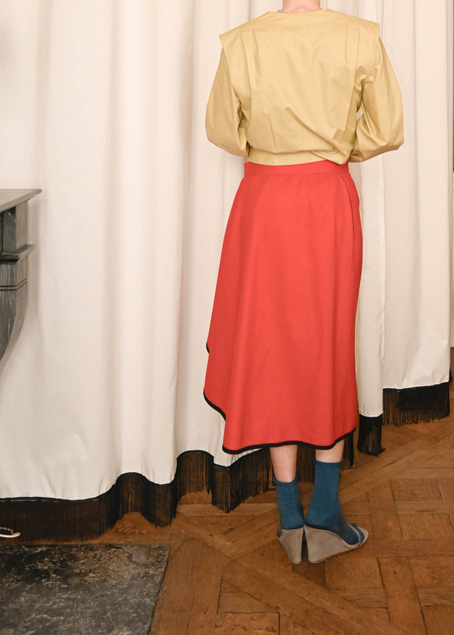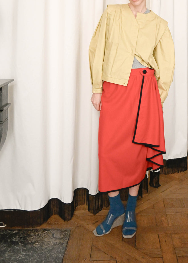 MADE IN FRANCE IN A WOOL RED FABRIC AND A BLACK BORDER, ASYMMETRICAL CUT, THE PERFECT WINTER PIECE