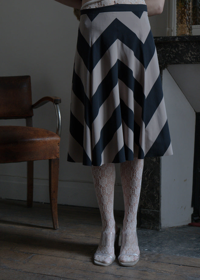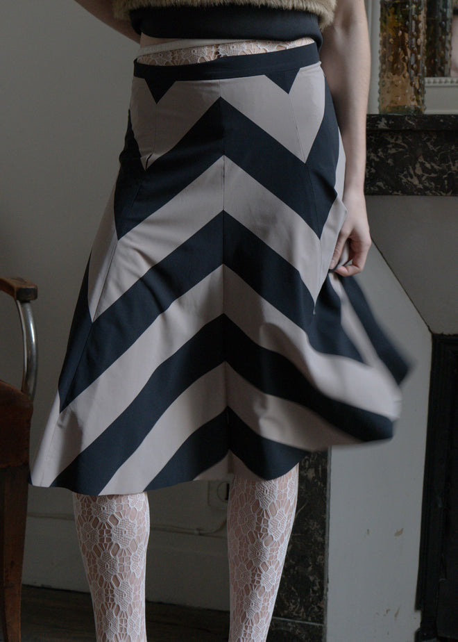 TRIANGULAR STRIPED DRESS IN STRETCH NYLON FABRIC IN SOFT GREY AND BLACK, CLOSED WITH A DISCREET ZIP