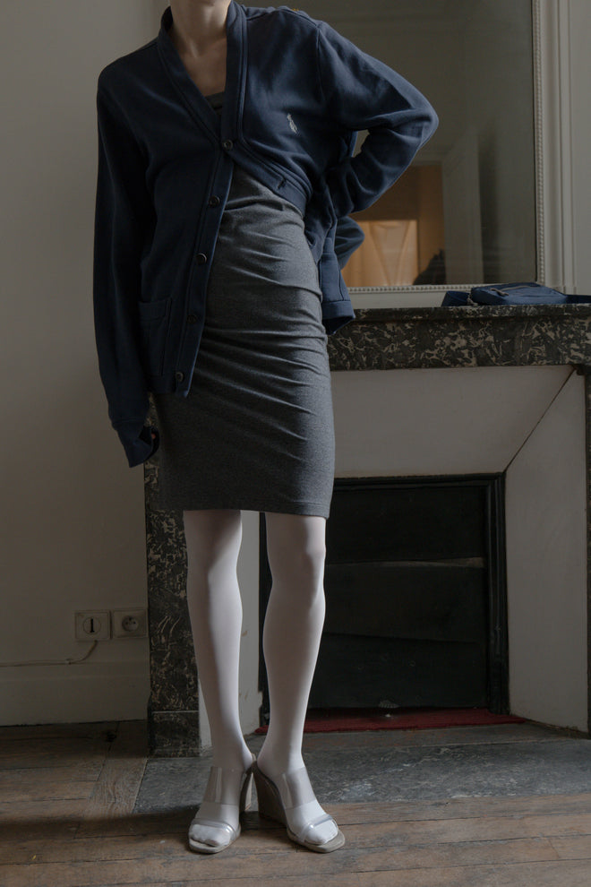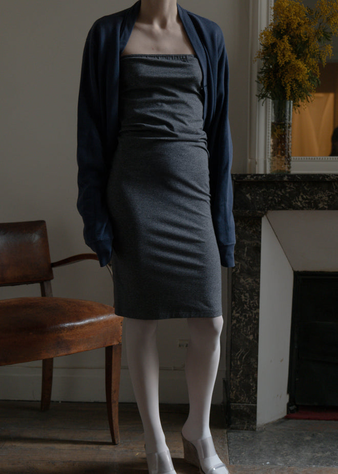 STRAPLESS TUBE DRESS MADE IN STRETCHY COTTON MATERIAL, A DARK ASH GREY, PERFECT FOR LAYERING AN OUTFIT AND CAN BE DOUBLED AS A SKIRT