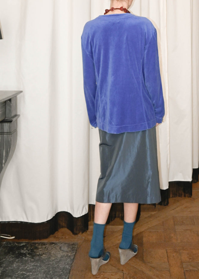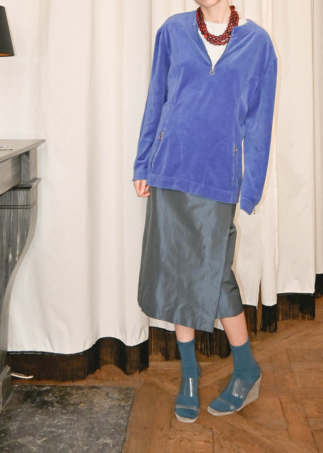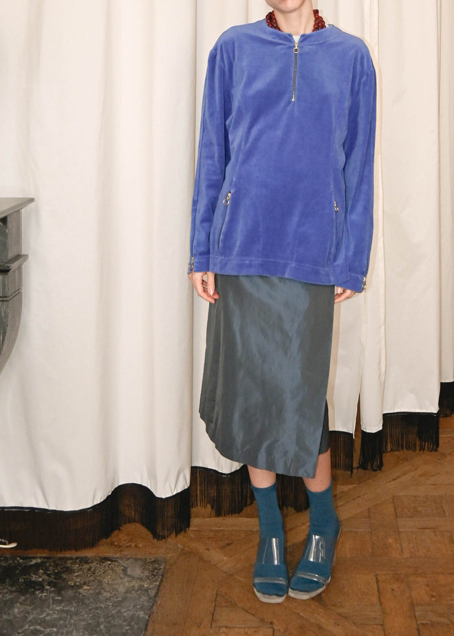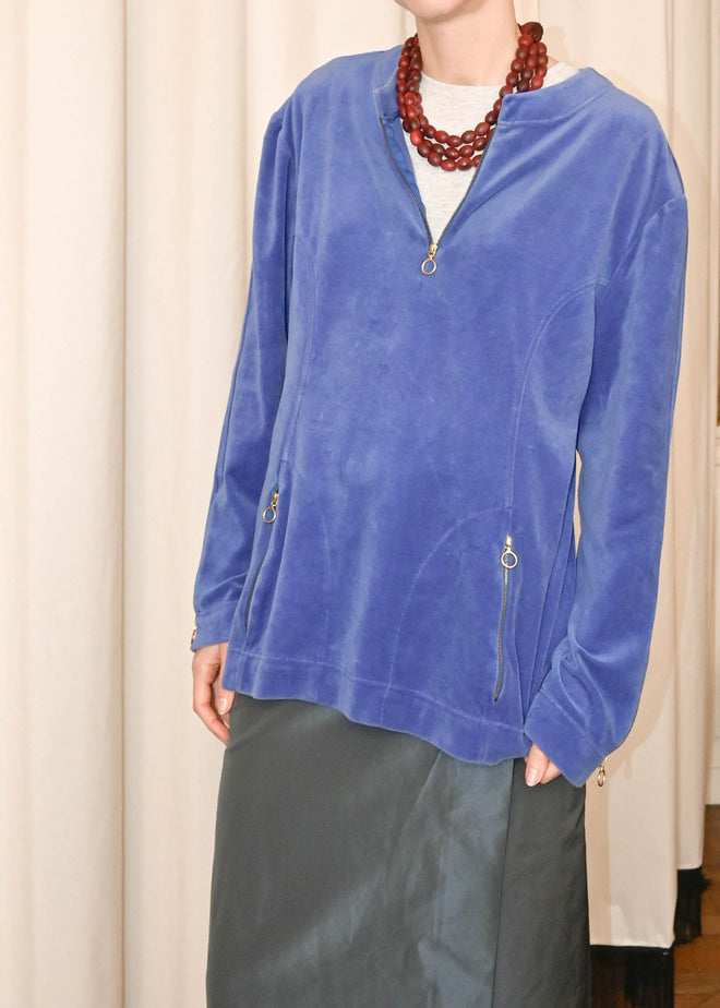 BLUE VELVET JUMPER WITH HIGH NECK COLLAR AND ZIP DETAILS, ON POCKETS AND SLEEVES FOR AN OPEN LOOK